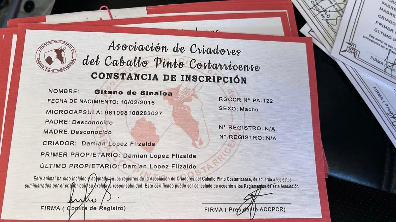- Cuenta con constancia de inscripción en la Asociación de Criadores del Caballo Pinto Costarricense