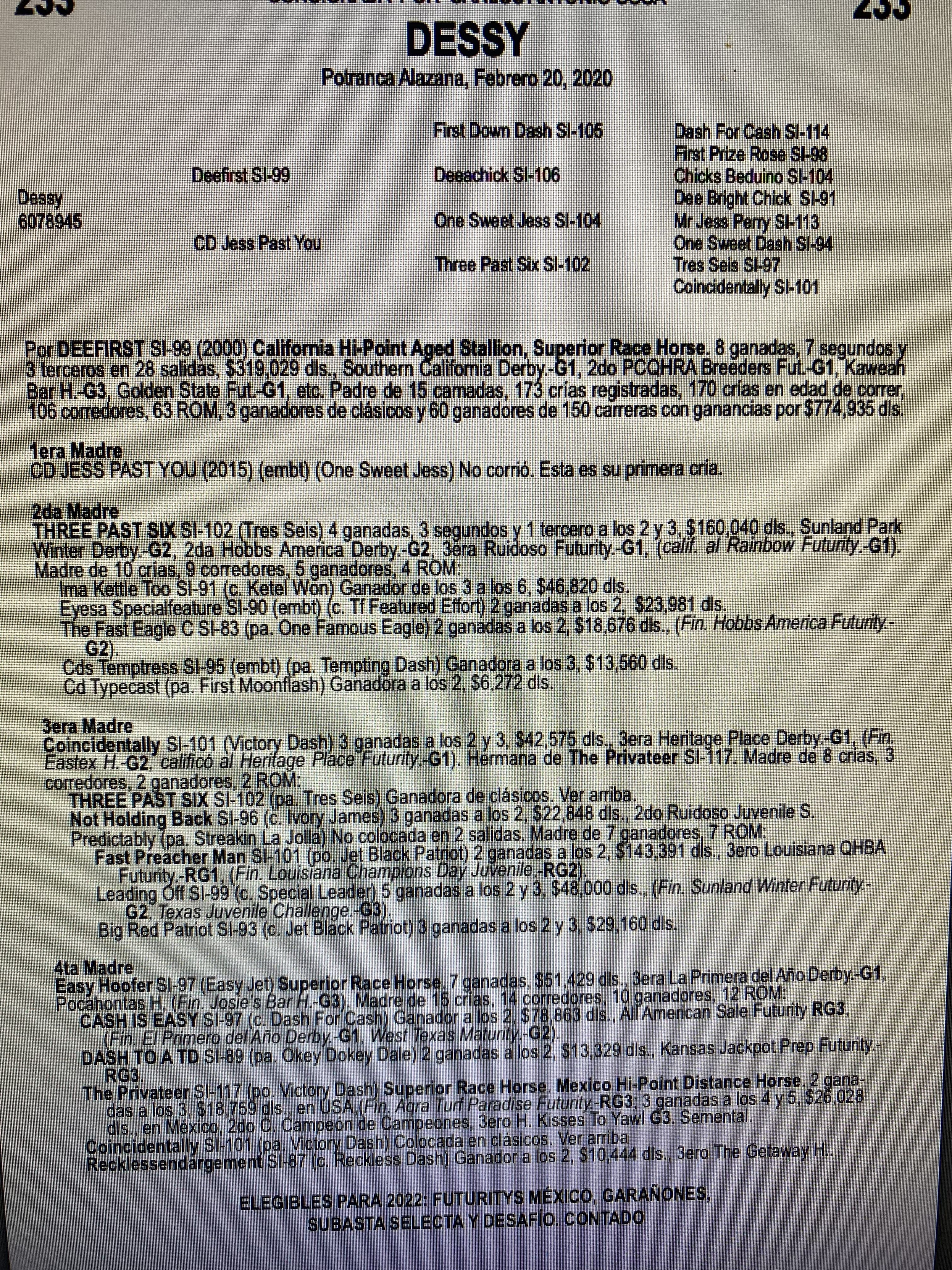 DEEFIRST SI-99 (2000) California Hi-Point Aged Stallion, Superior Race Horse. 8 ganadas, 7 segundos y 3 terceros en 28 salidas, $319,029 dls., Southern California Derby.-G1, 2do PCQHRA Breeders Fut.-G1, Kaweah Bar H.-G3, Golden State Fut.-G1, etc. Padre de 15 camadas, 173 crías registradas, 170 crías en edad de correr, 106 corredores, 63 ROM, 3 ganadores de clásicos y 60 ganadores de 150 carreras con ganancias por $774,935 dls.